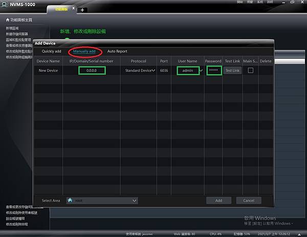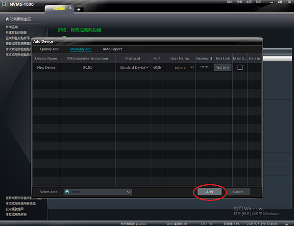 六、將手機查的IPv4位址 填入,並輸入帳號、密碼,按下右下角的 "Add"鍵 完成新增。