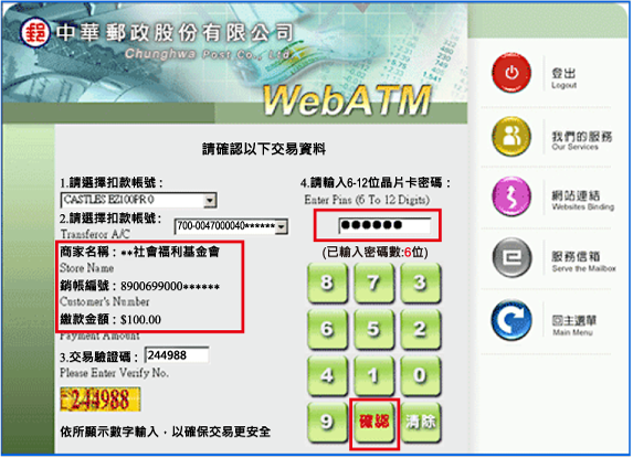 至郵局網路ATM(http://webatm.post.gov.tw)選擇讀卡機並插入晶片卡登入,透過畫面的虛擬鍵盤,輸入晶片金融卡密碼,按下確認鈕。