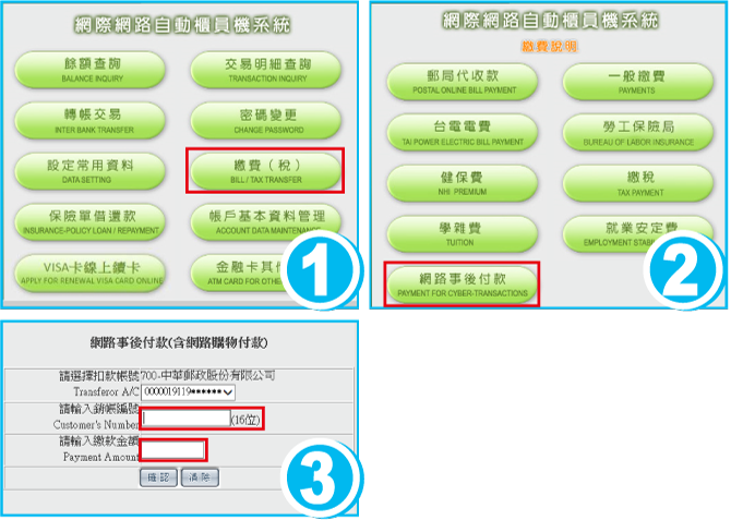 登入後先點「繳費(稅)」,再選擇「網路事後付款」,輸入銷帳編號及繳款金額,再按確認鈕。